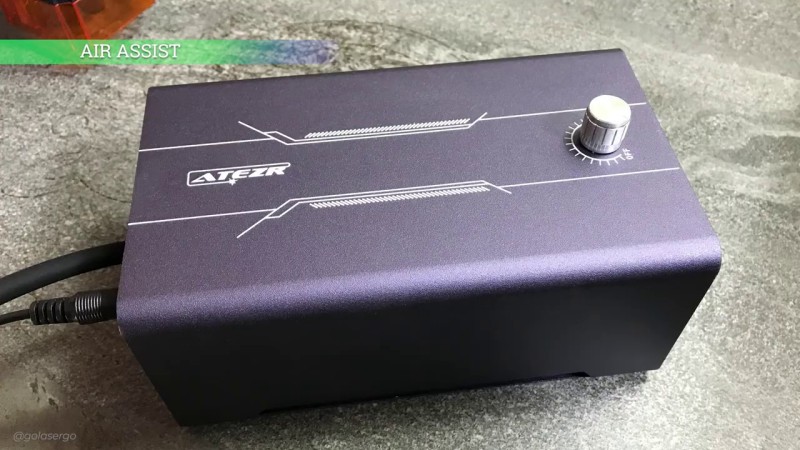 It’s super quiet and the air flow is adjustable. Now the air assist only works when the machine is running.