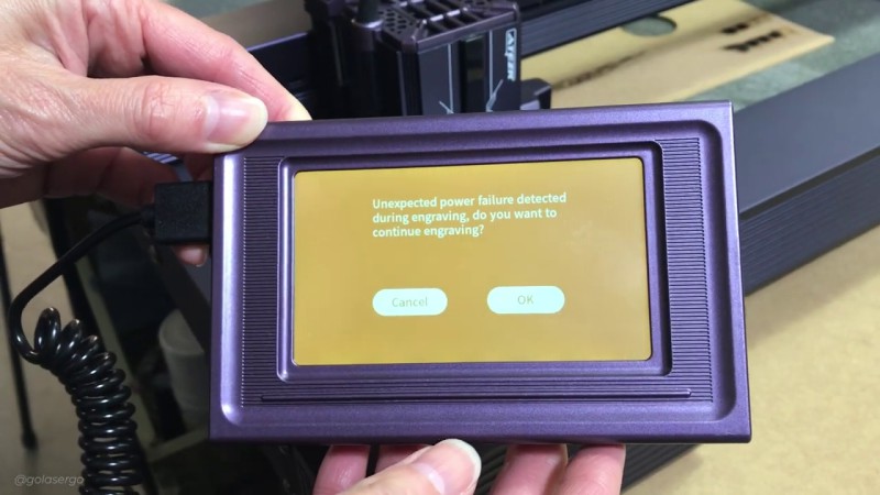 To demonstrate this in the video, we set the function then started engraving. Then we turned the machine off to simulate a power outage. When we turned the machine back on the message on the screen asked if we wanted to continue and we clicked YES.
