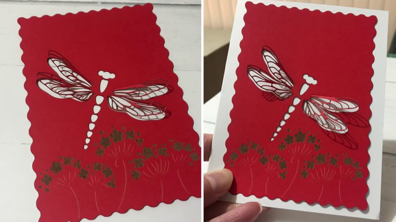For the dragonfly card we engraved and cut out the design. There are some very fine lines that needed to be cut and I wondered how the machine would handle such fine work. Need I say, it cut the fine lines perfectly.