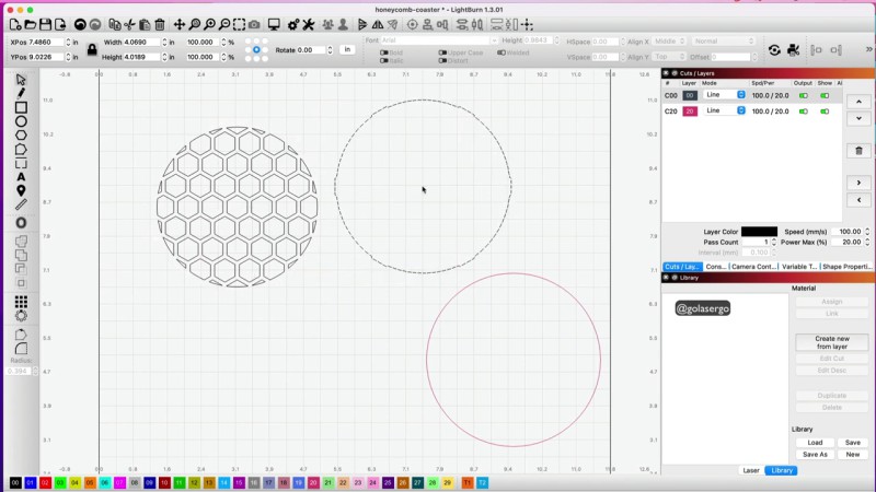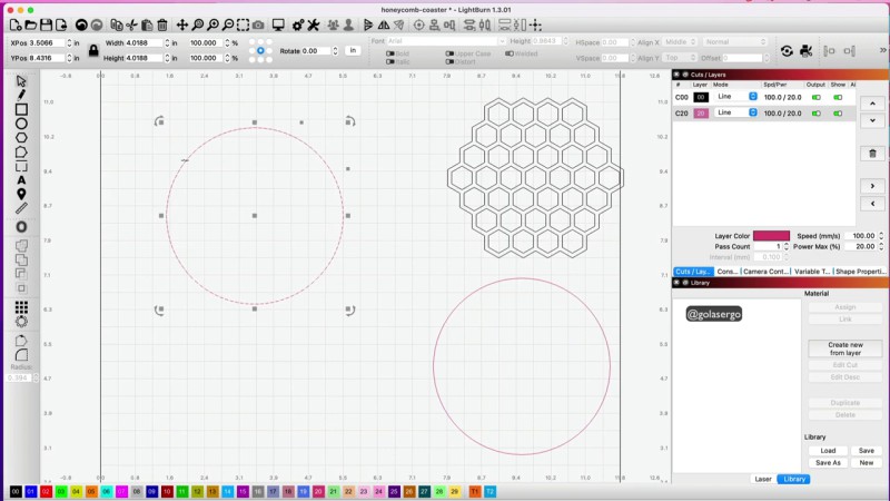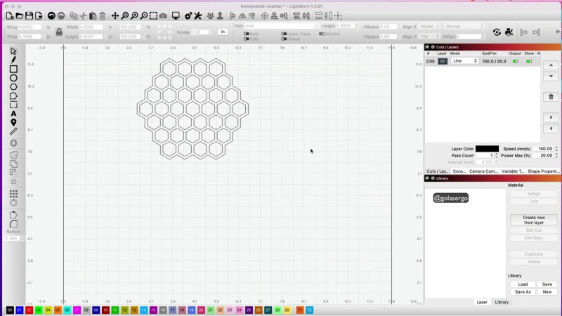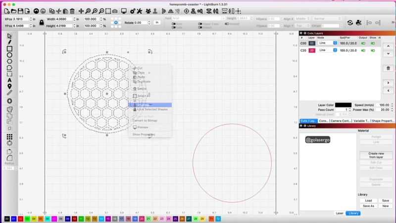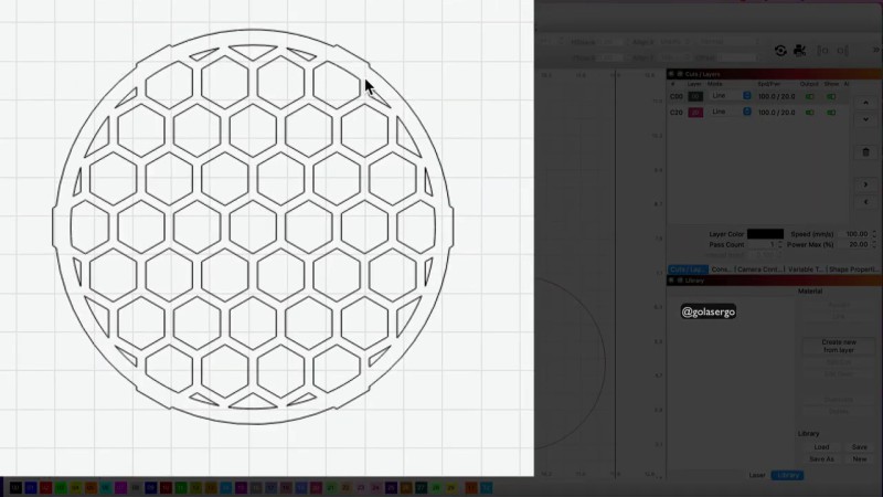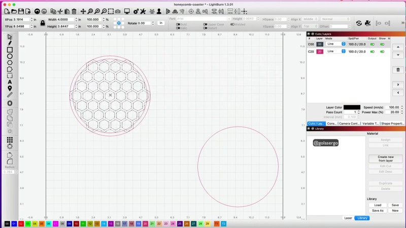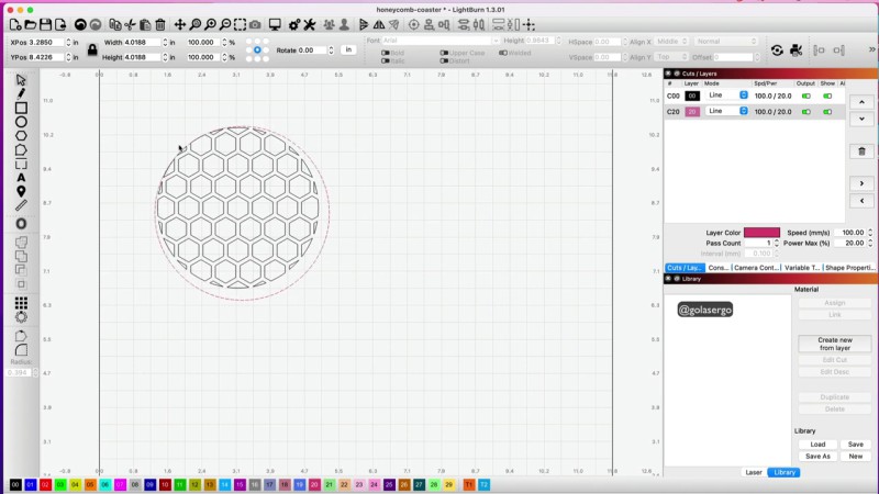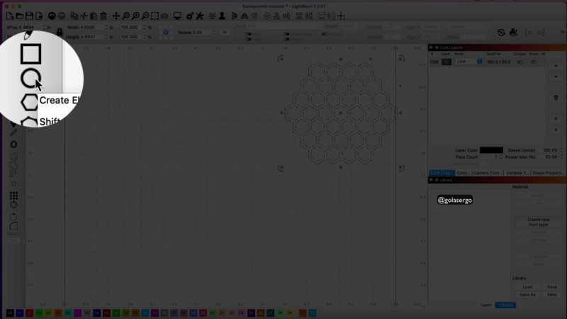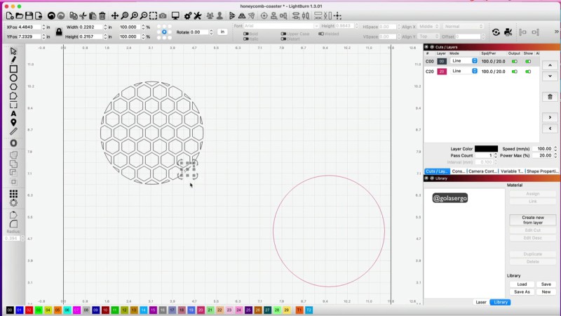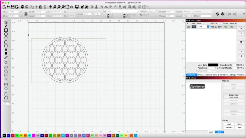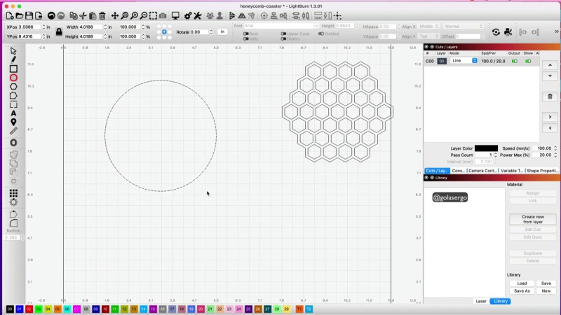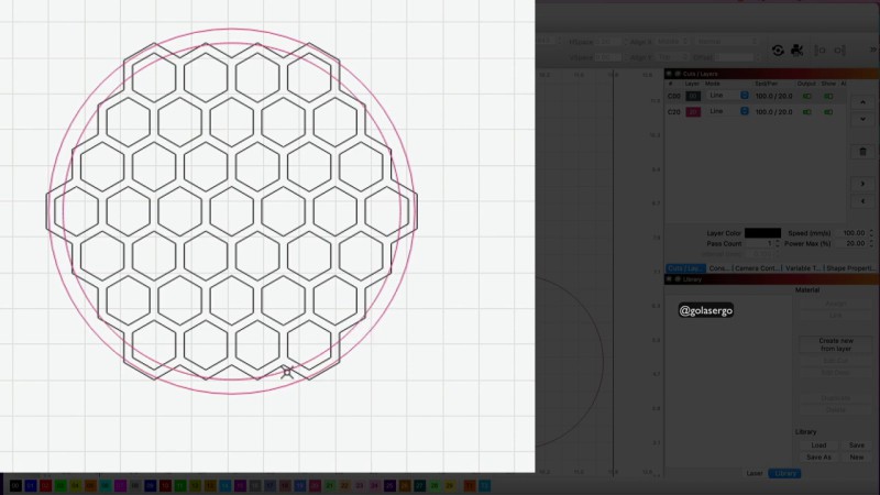 So the first thing we do is make our honeycomb coaster and have that file in the lightburn workspace. If you have previously saved the file you will just bring the file in from your computer, otherwise you can create the coaster following our instructions.