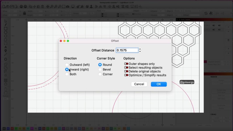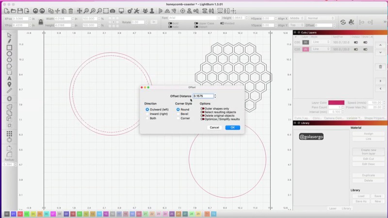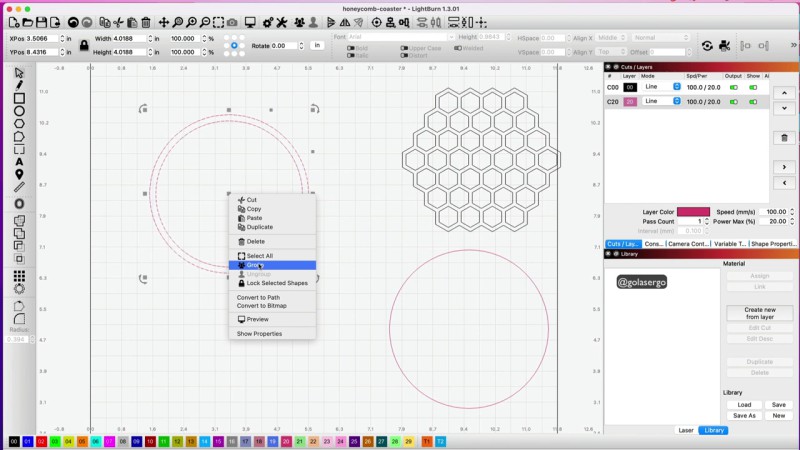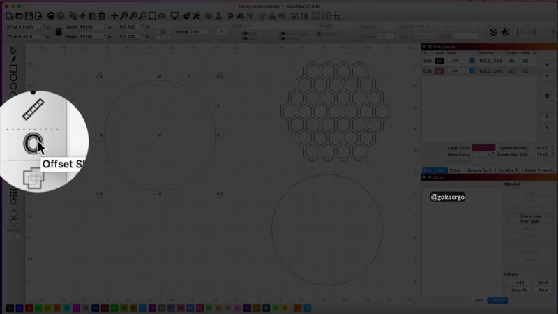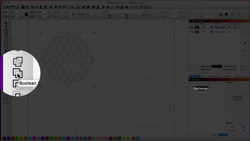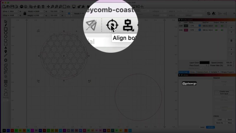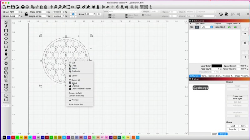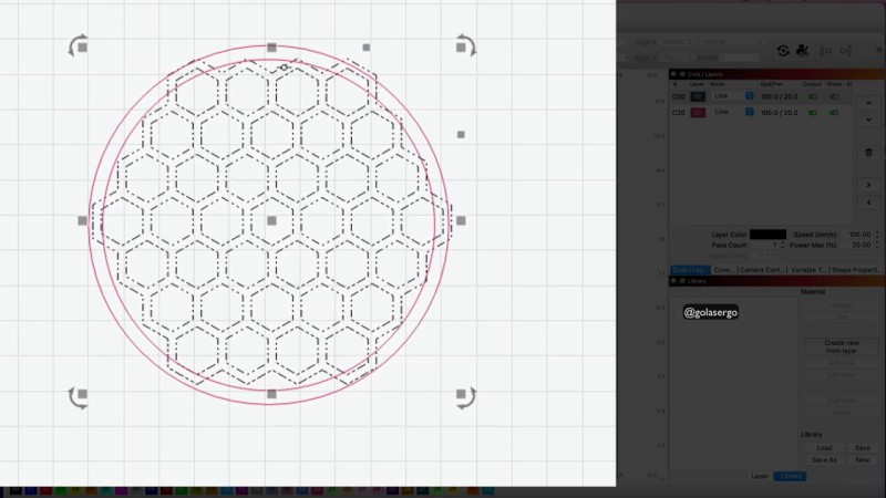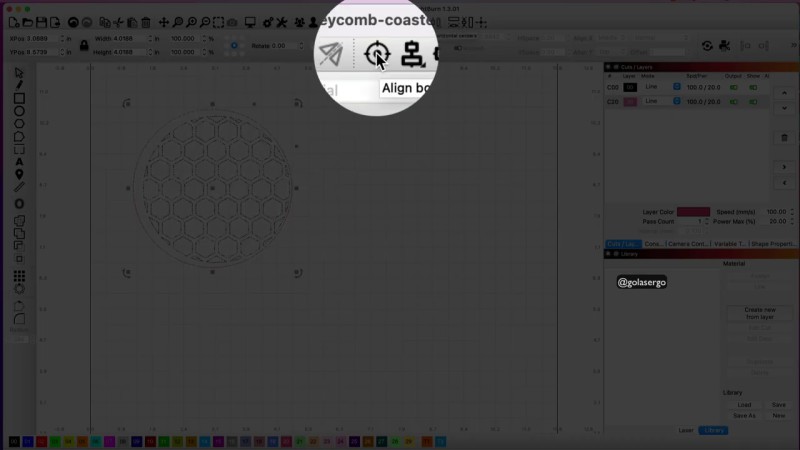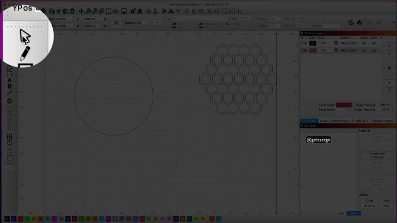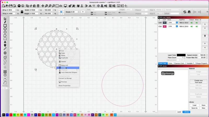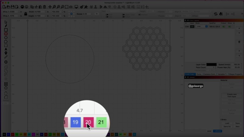 So the first thing we do is make our honeycomb coaster and have that file in the lightburn workspace. If you have previously saved the file you will just bring the file in from your computer, otherwise you can create the coaster following our instructions.