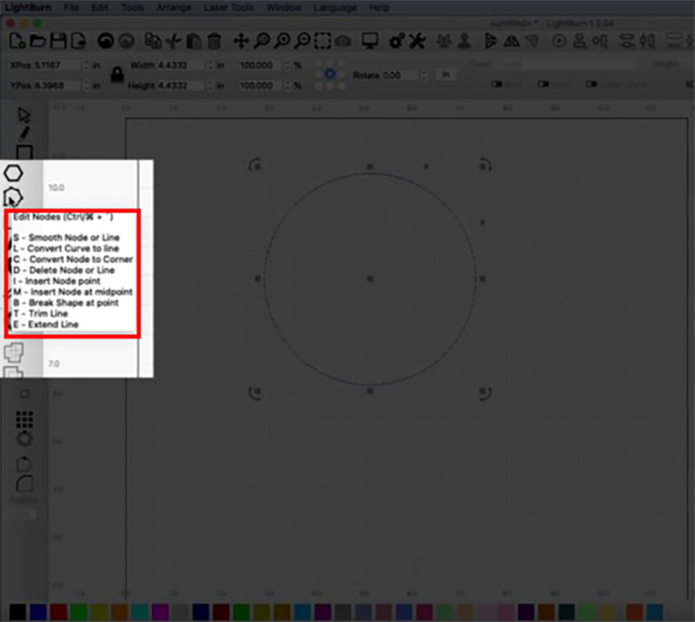 Click the “Edit Nodes” icon in the left menu. As you hover your mouse over it, you’ll notice some options appear underneath. These options are represented by letters, indicating the corresponding keyboard shortcuts.
