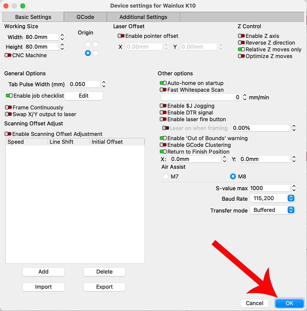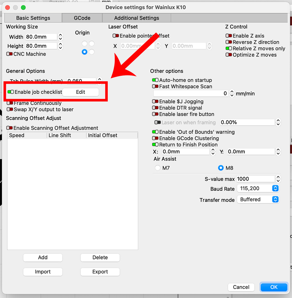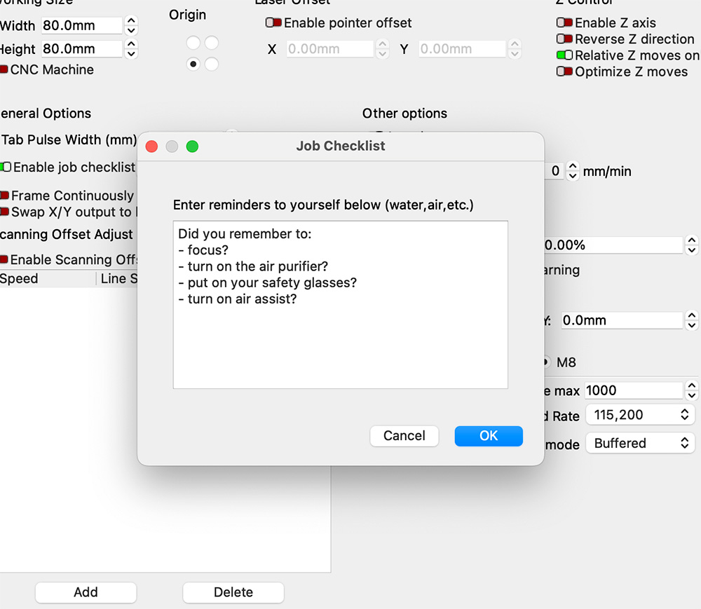 - If you select YES, Lightburn will assume that you have met all the reminders in the checklist and proceed to start the engraving.