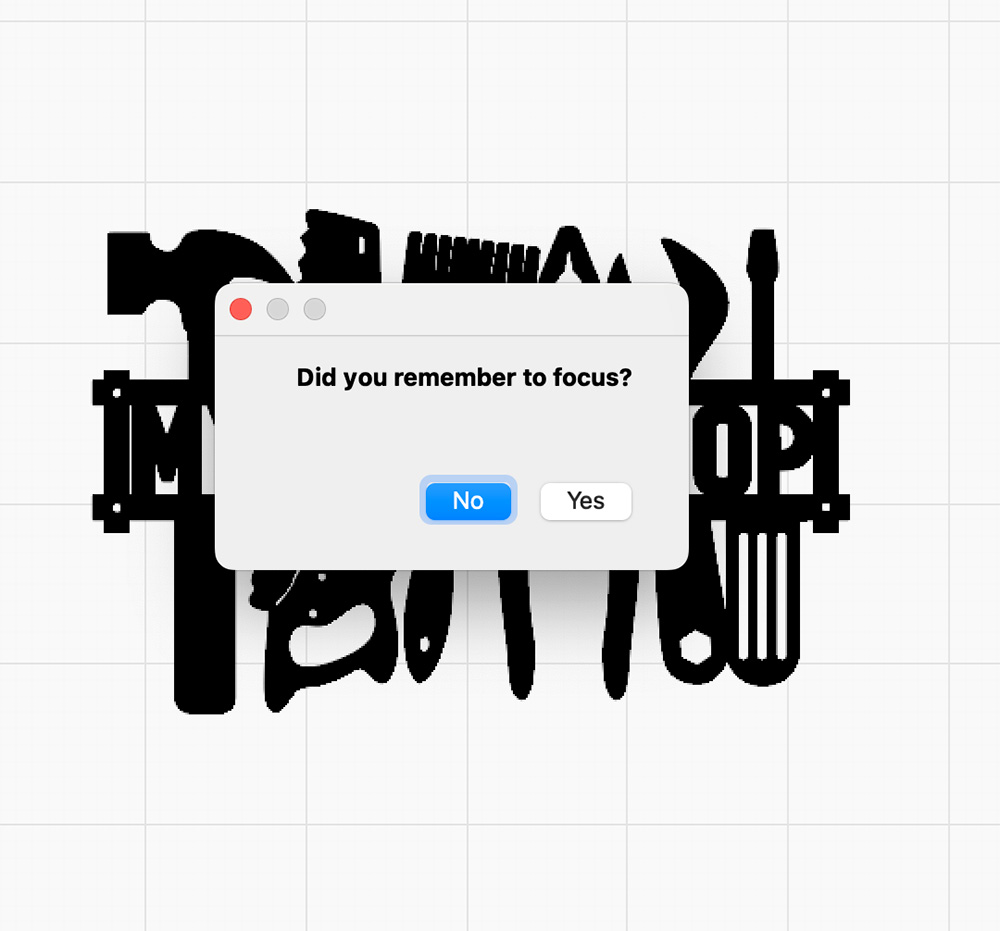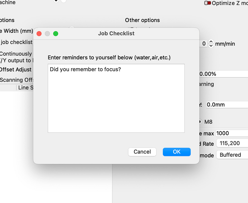 Fortunately, Lightburn has a feature that reminds you to focus. And the beauty of this feature is that you can use this for all sorts of reminders, not just for focusing. It can be used for any reminder you might need before you start to engrave.